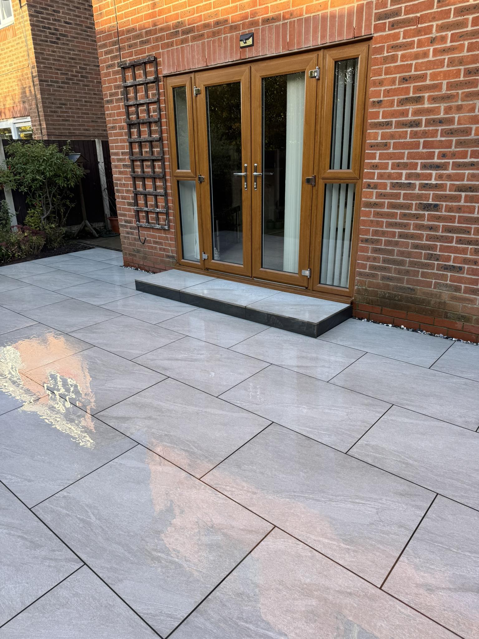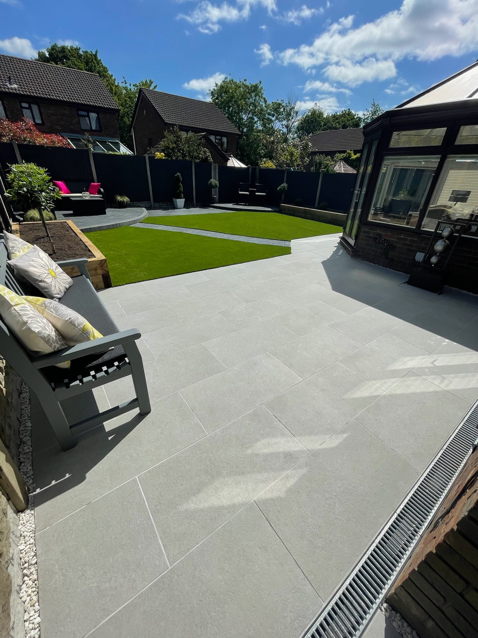 - Light grey porcelain paving provides a sleek, contemporary patio ideal for entertaining.