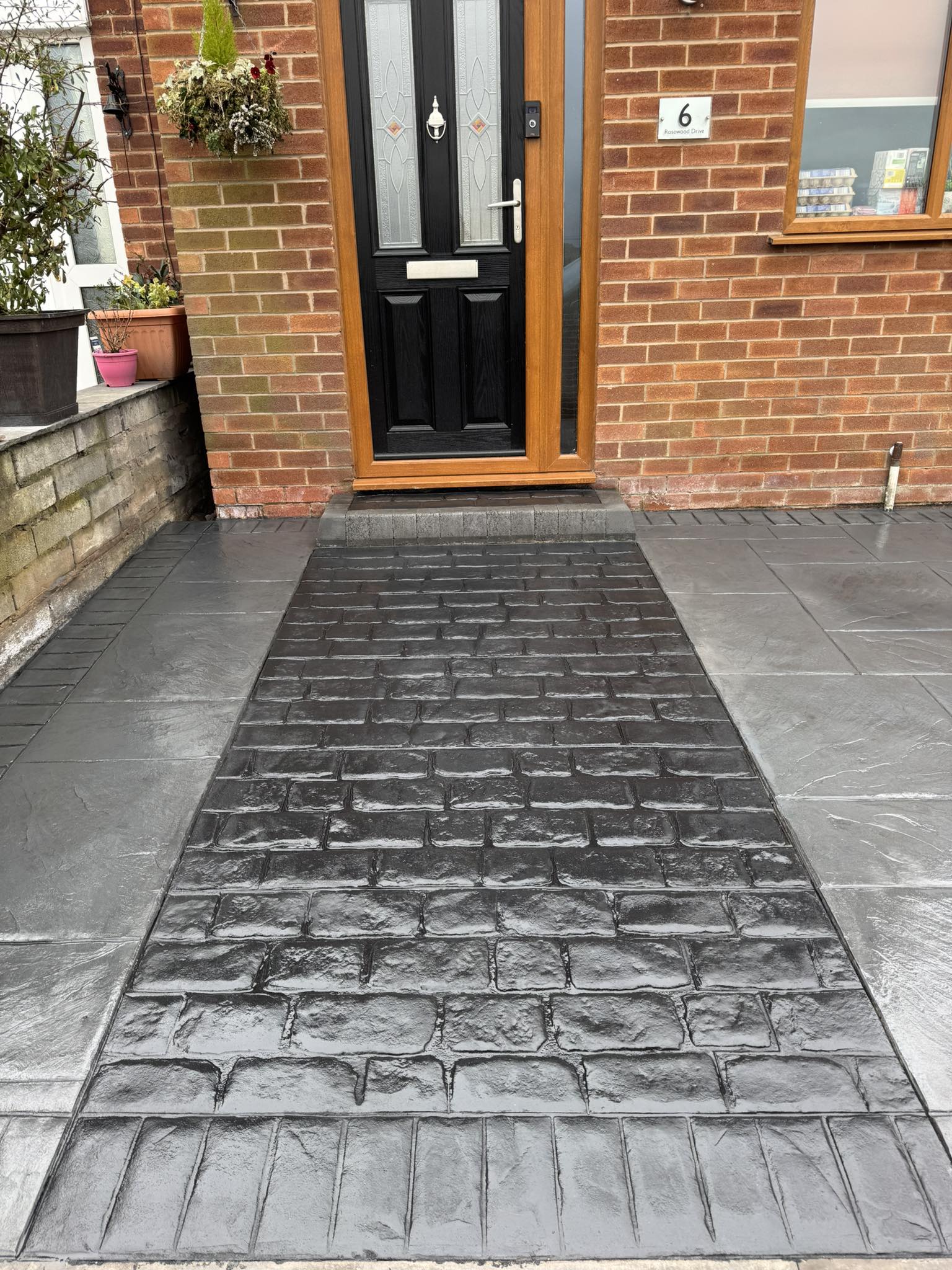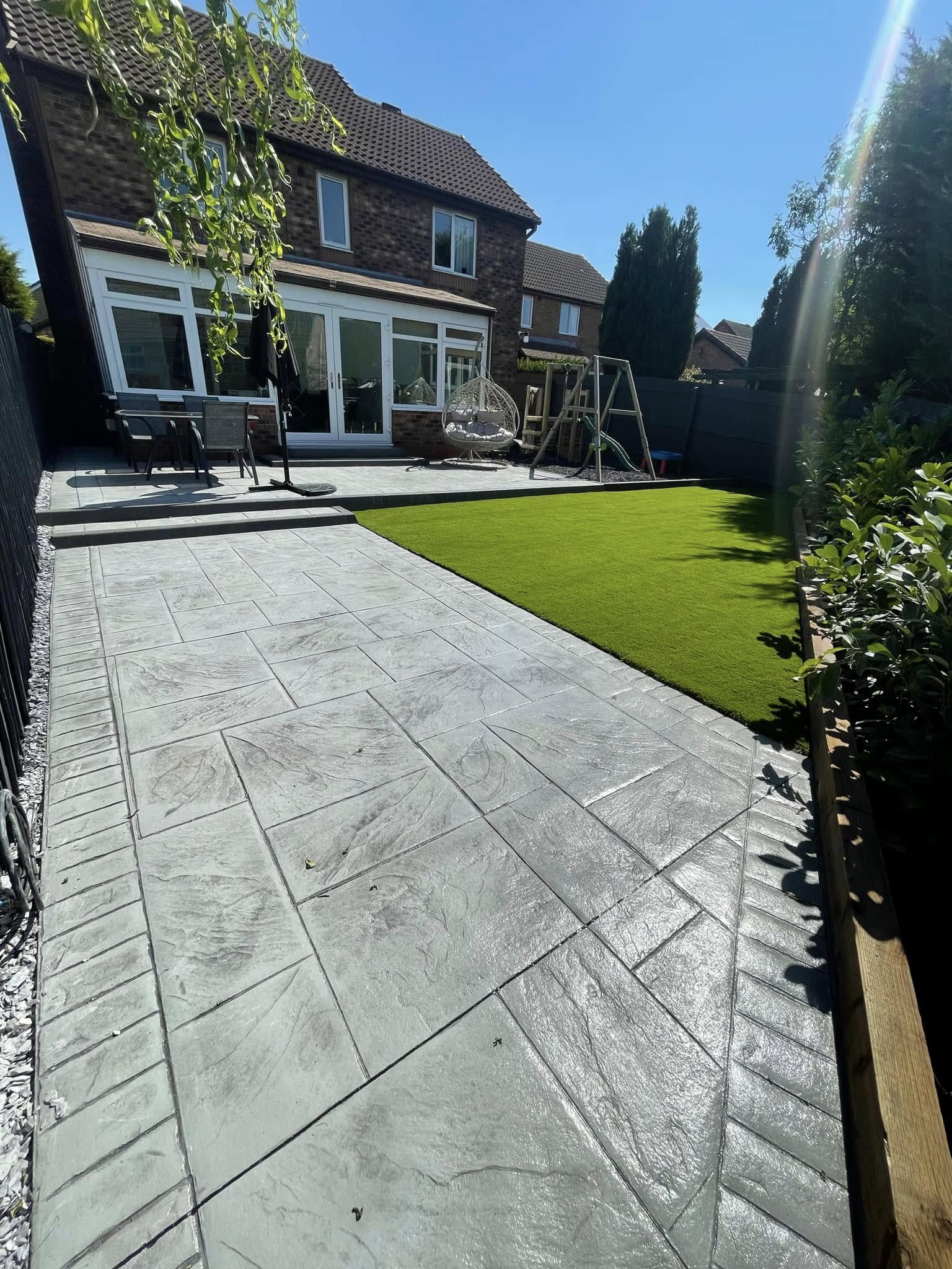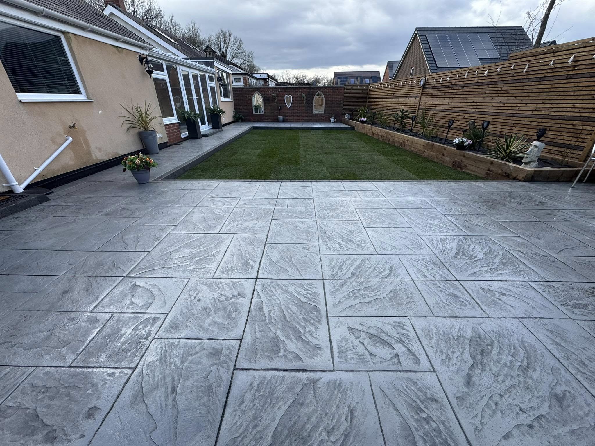 A virtually no maintenance patio using imprinted concrete without the HUGE price tag. A cost effective way for a beautiful garden is available with us! We are confident the owners will be enjoying this back garden for many years to come. The colours used match properties with new grey windows and upvc around the property.