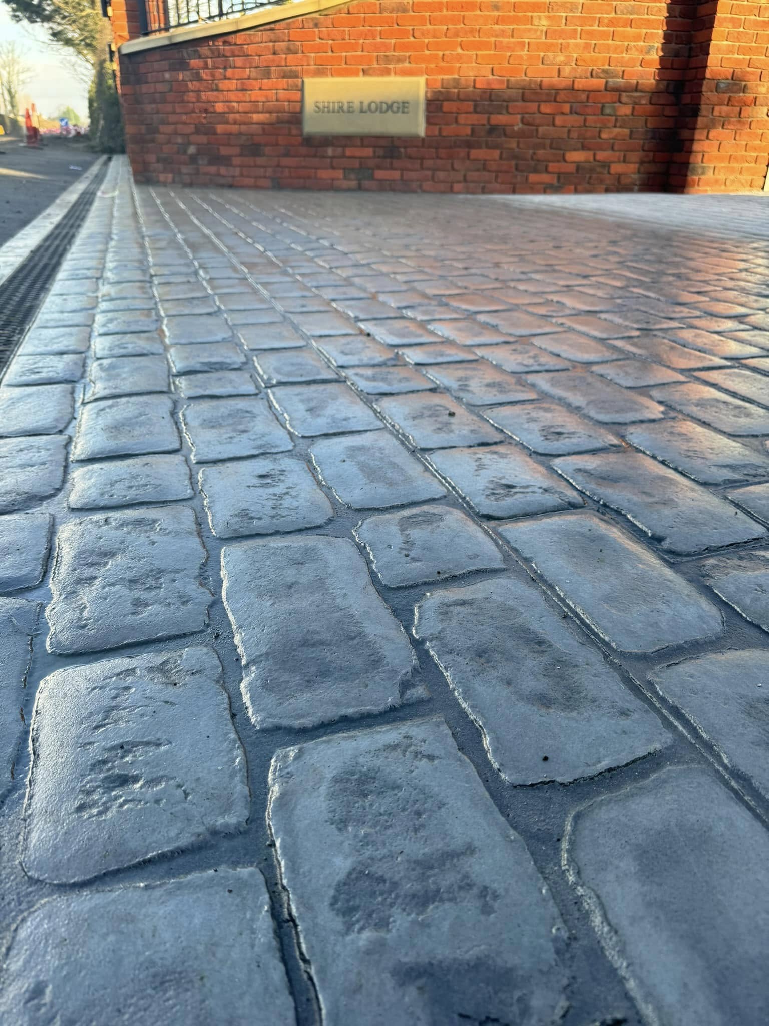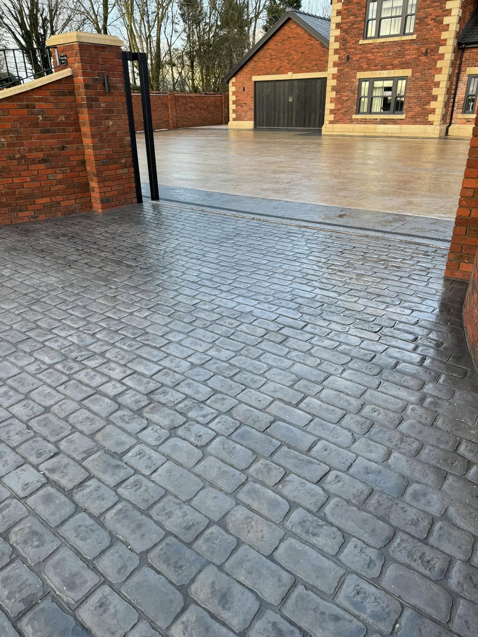 A low maintenance yet stunning driveway – imprinted concrete with a traditional cobble effect.